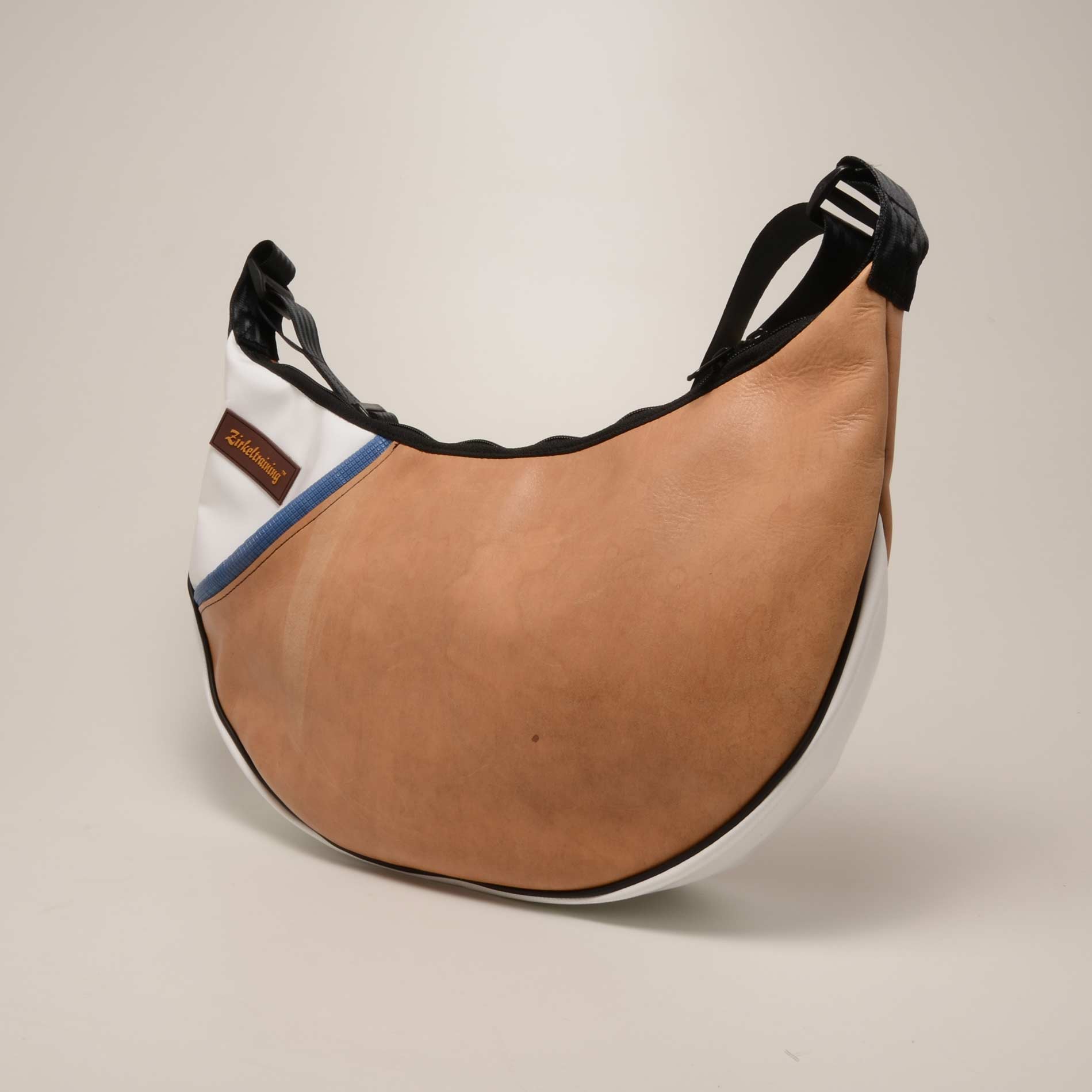 Tasche aus gebrauchtem Sportgeräte-Leder, weißer LKW-Plane und recycelter Turnmatte